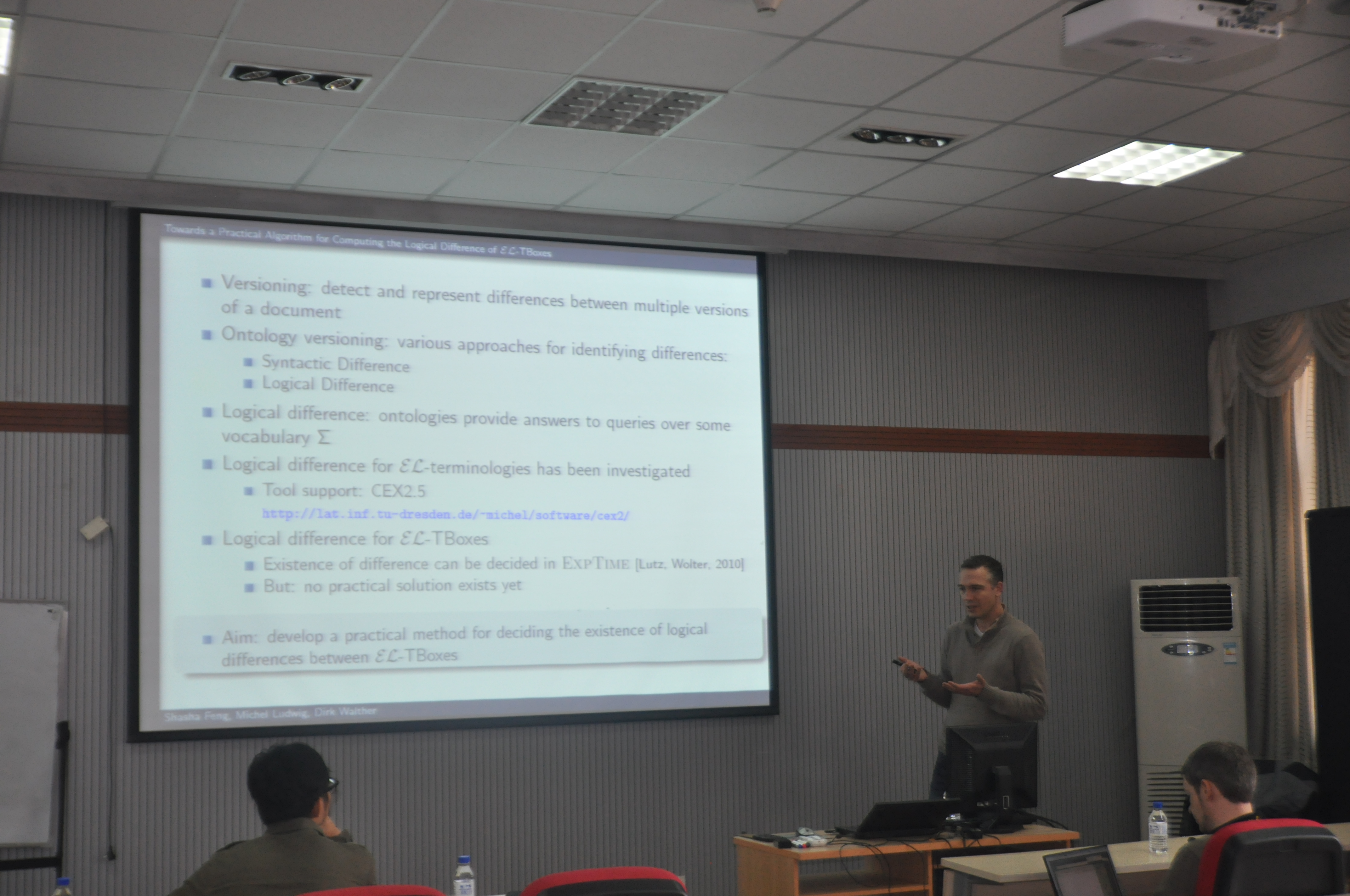 在计算机科学与信息科学中,本体作为一种知识表示方法为特定领域中的概念及其相关之间关系提供形式化表达。本体的构建与维护需要本体的版本控制来管理同一本体的不同版本。2008年提出的本体间的逻辑差概念能更准确地体现本体不同版本间的语义差别。EL术语集之间的逻辑差求解问题已经解决,但是,表达能力更强的EL TBox之间的逻辑差求解算法仍然未知。Walther博士在讲座中讲解了其最新的研究成果,并且很愿意在接下来的两周时间里与相关师生继续探讨。来自数学学院和计算机学院的师生听取了讲座。
