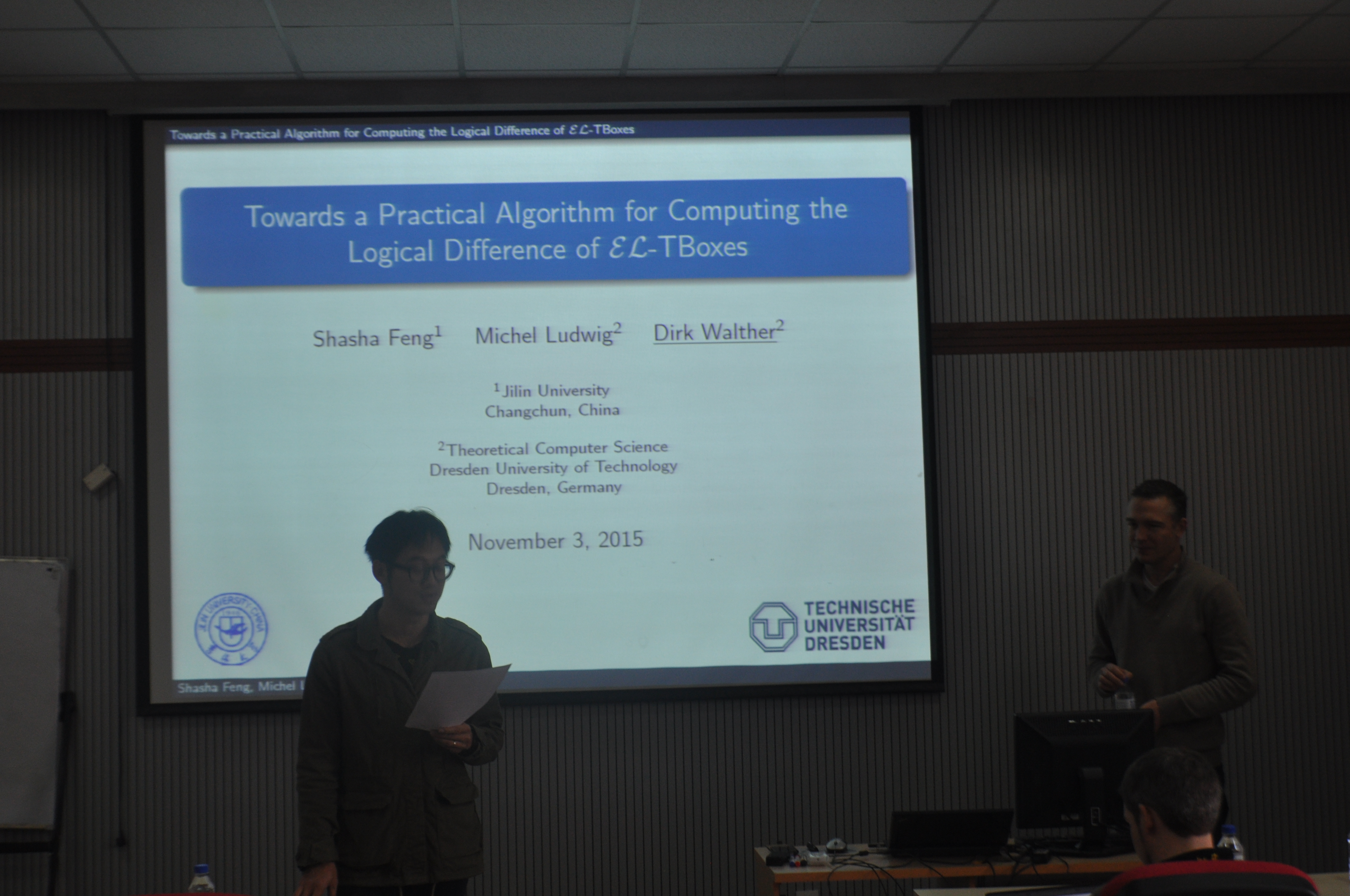 国际处的青年骨干教师引智培育计划项目资助。 2015年11月3日上午,Dirk Walther博士做题为“寻找计算EL-TBoxes逻辑差的实用算法”的学术报告。