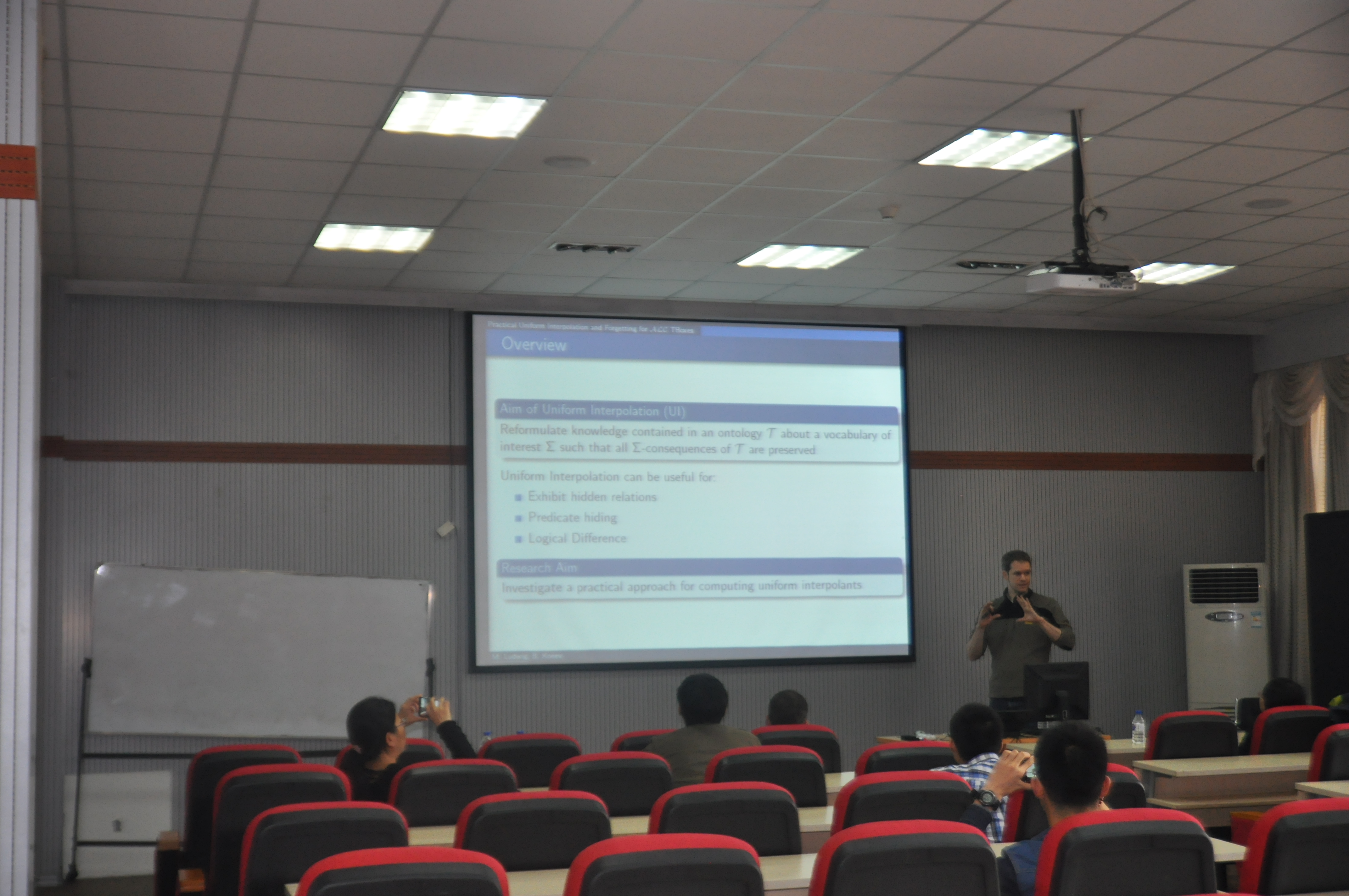 国际处的青年骨干教师引智培育计划项目资助下来我校进行为期两周的学术交流活动。2015年11月4日上午,Michel Ludwig博士做题为“实用的 ALC TBoxes的规范插值与遗忘算法及其在逻辑差中的应用”的学术报告。