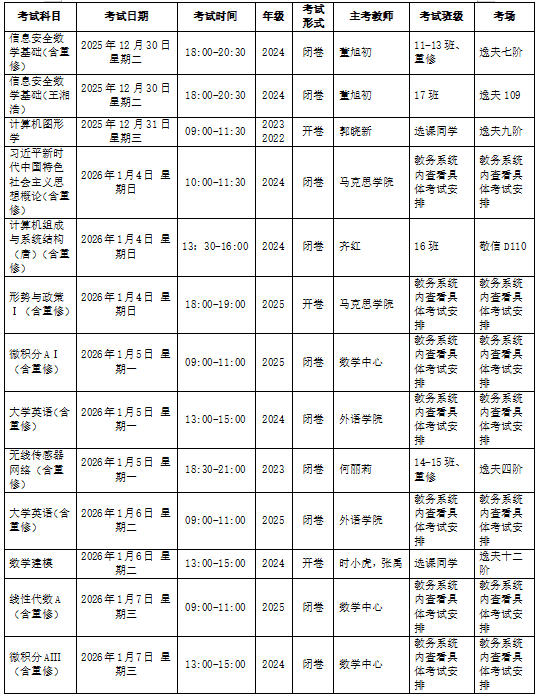 本学期第18周到考试周期末考试安排如下: