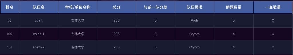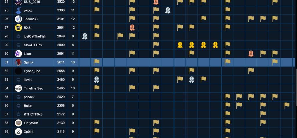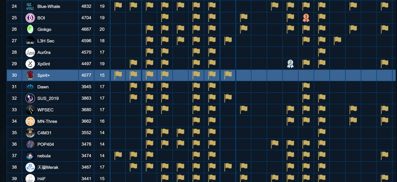 和其他学院的8名学生组成的Spirt+战队在此次比赛中成功解出15道题目,获得4077分,在705支参赛队伍中取得了第30名的成绩,排进了前5%,对各个题型都有不同程度的突破。