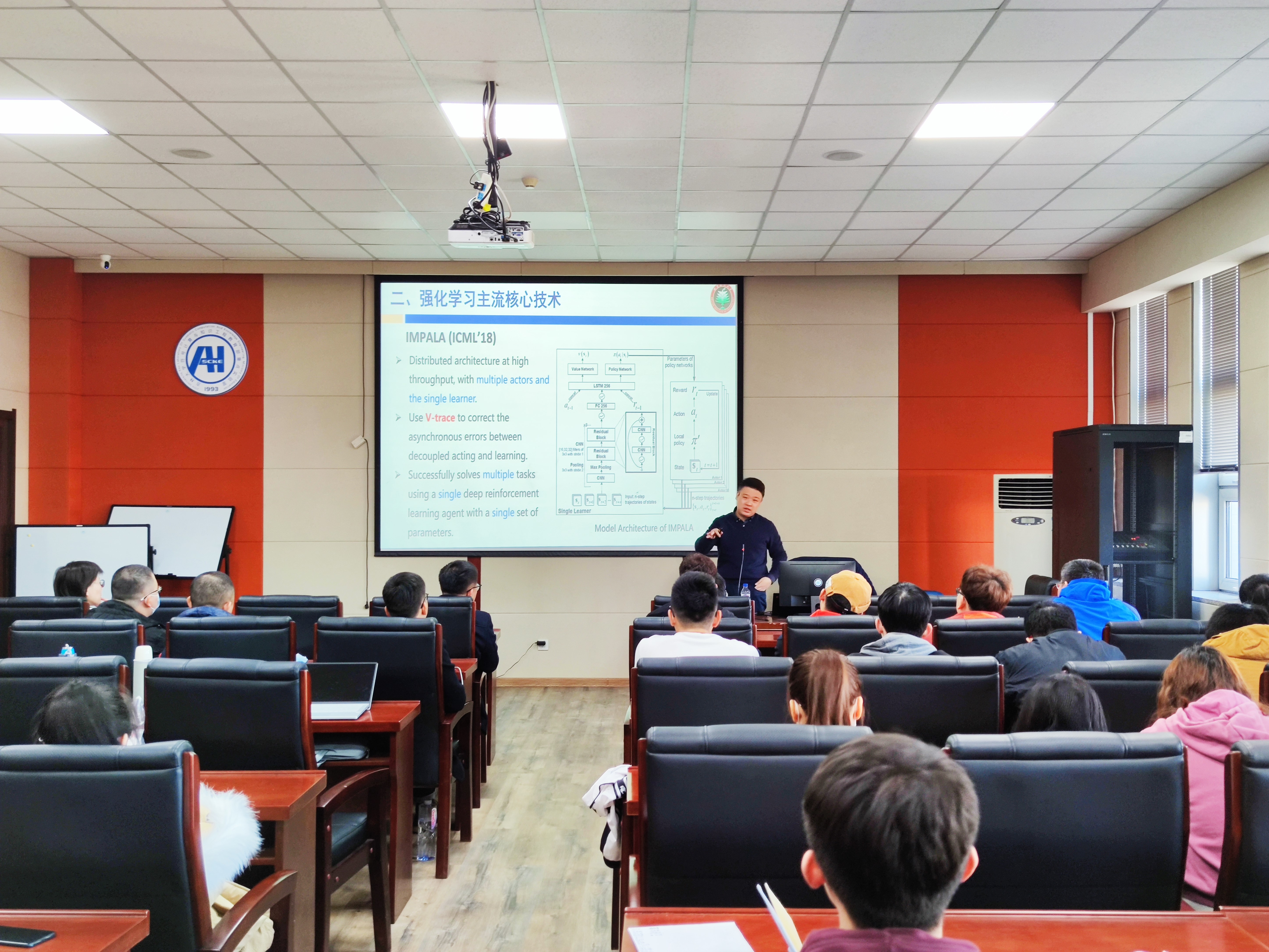 刘驰教授首先为大家介绍了群智感知技术,即利用人所携带的智能终端,或无人移动平台(自动驾驶汽车、无人机等)所携带的丰富的传感器对物联网类大数据进行采集,可以在智慧城市、紧急灾难救助等诸多方面发挥重要的作用。之后刘驰教授从多个方面介绍了深度强化学习的研究历程以及强化学习的主流核心技术。报告中,刘驰教授用简单易懂的图片展示和样例分析的方式使师生更好了解什么是强化深度学习主流技术,并对其中涉及的算法、样本、模型训练、优缺点等进行了详细介绍,最后刘教授为大家介绍了移动无人机群智能感知方面由单智能体到多智能体、单任务到多任务、集中式到分布式的研究模型,以形成高效、安全的物联网类大数据采集新模式并对未来提出展望。
