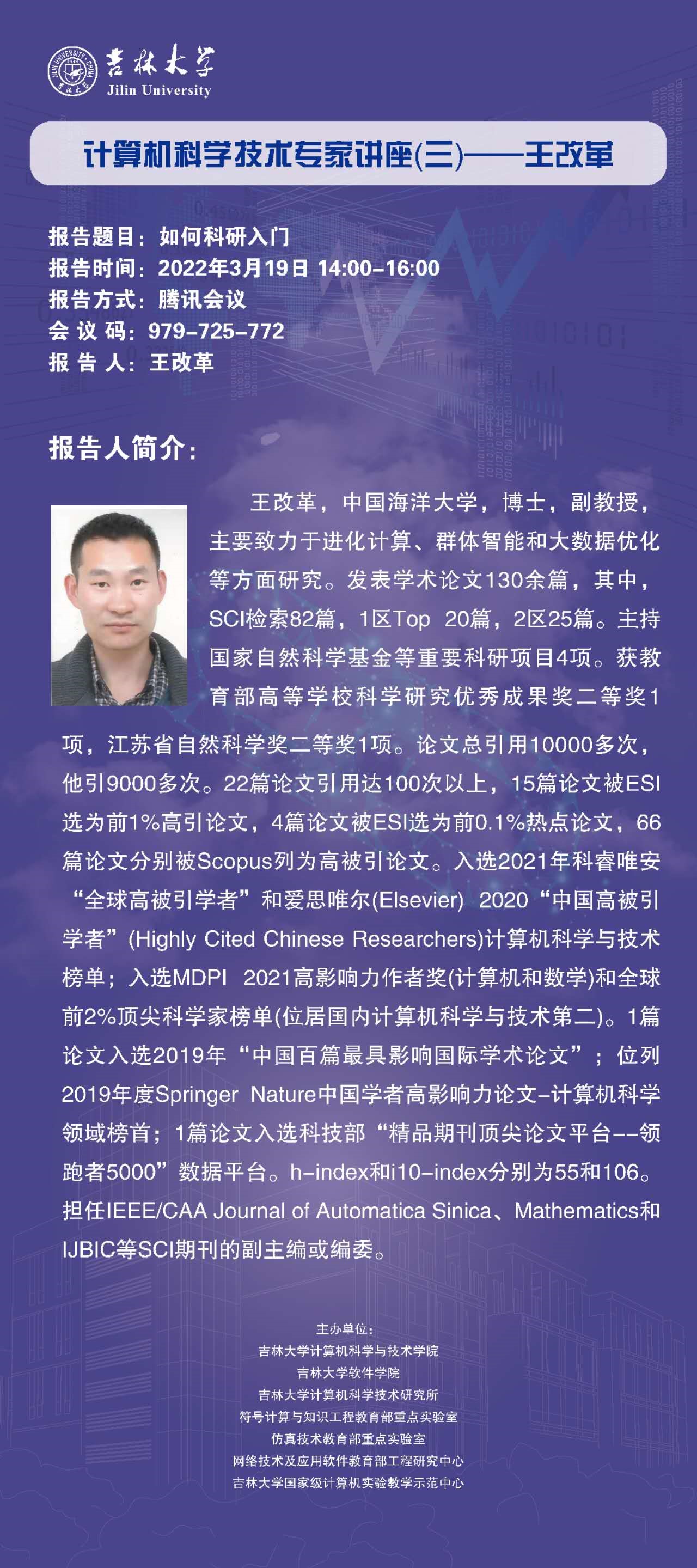 王改革老师目前是中国海洋大学副教授,主要致力于进化计算、群体智能和大数据优化等方面研究。发表学术论文130余篇,其中,SCI检索82篇,1区Top 20篇,2区25篇。主持国家自然科学基金等重要科研项目4项。获教育部高等学校科学研究优秀成果奖二等奖1项,江苏省自然科学奖二等奖1项。论文总引用10000多次,他引9000多次。22篇论文引用达100次以上,15篇论文被ESI选为前1%高引论文,4篇论文被ESI选为前0.1%热点论文,66篇论文分别被Scopus列为高被引论文。入选2021年科睿唯安“全球高被引学者”和爱思唯尔(Elsevier) 2020“中国高被引学者”(Highly Cited Chinese Researchers)计算机科学与技术榜单;入选MDPI 2021高影响力作者奖(计算机和数学)和全球前2%顶尖科学家榜单(位居国内计算机科学与技术第二)。1篇论文入选2019年“中国百篇最具影响国际学术论文”;位列2019年度Springer Nature中国学者高影响力论文-计算机科学领域榜首;1篇论文入选科技部“精品期刊顶尖论文平台--领跑者5000”数据平台。h-index和i10-index分别为55和106。担任IEEE/CAA Journal of Automatica Sinica、Mathematics和IJBIC等SCI期刊的副主编或编委。