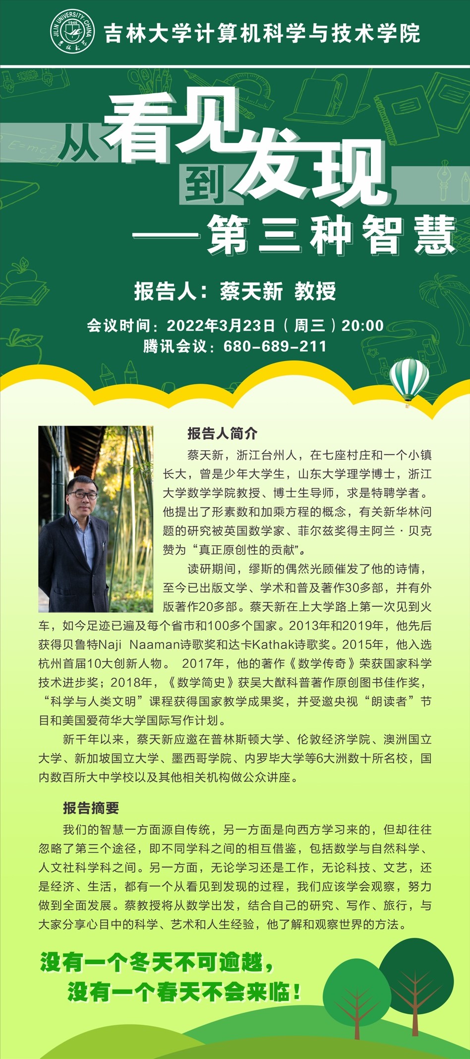 副院长张永刚教授主持了提问环节,参会的同学们提出了数学学习相关的问题,蔡老师一一作答。为了向支持计算机师生抗击疫情的可爱可敬的蔡老师表达感谢和敬意,计算机学院唐敖庆理科实验室的同学们朗诵了蔡天新教授的诗作。杨博院长最后做了总结,并向蔡天新老师发出诚挚的邀请:待疫情过后,邀请蔡老师莅临a片网