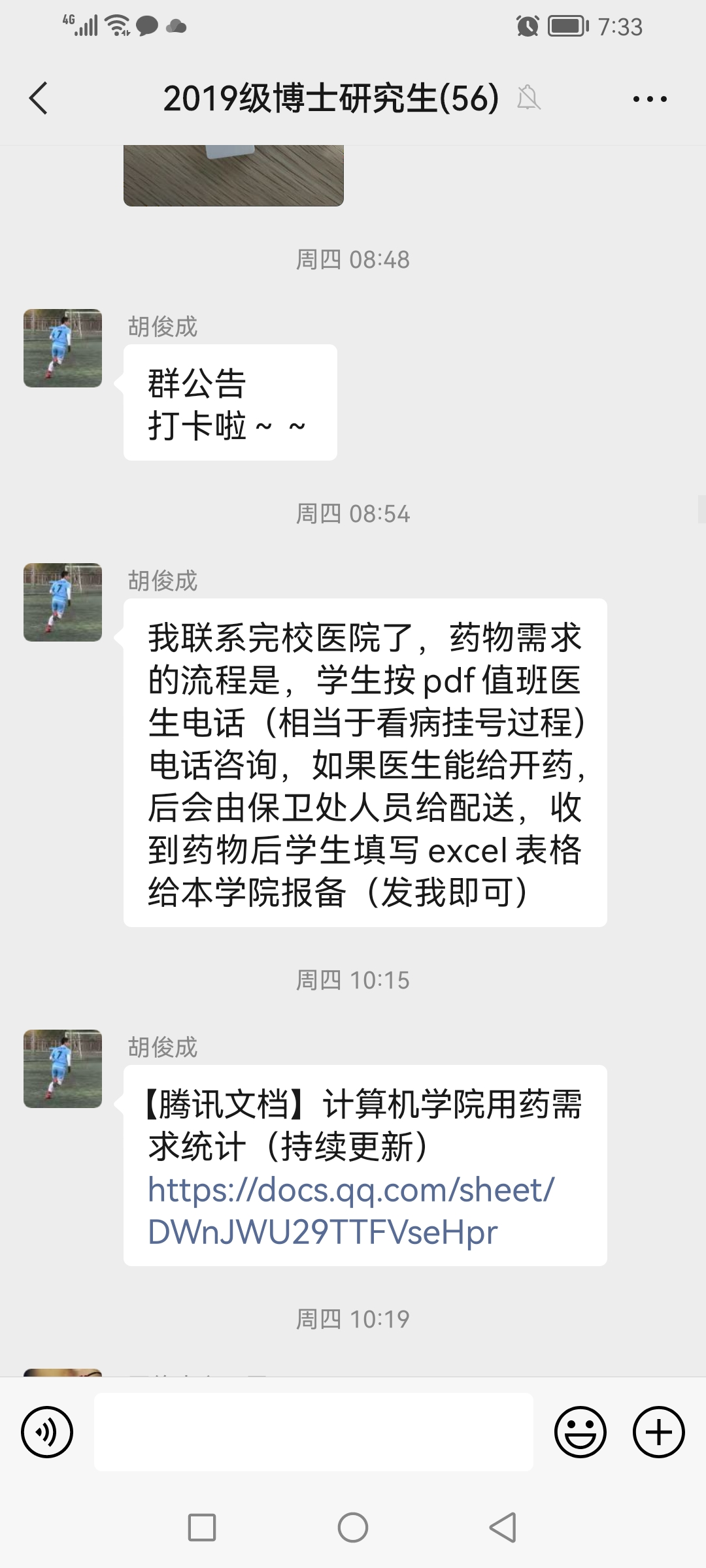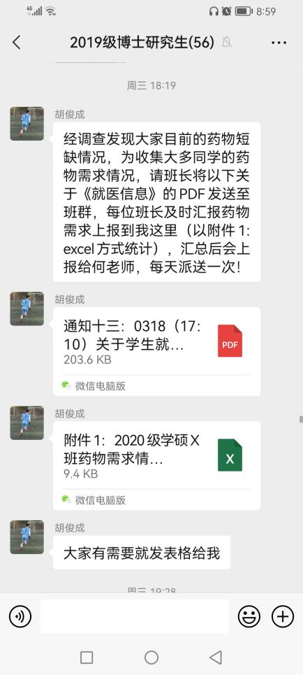 支部委员首先邀请两位班长发表抗疫期间的感想。班长郑婷婷在校内居住,根据自己的所观所想发表了自己最近的体会,她说道“虽然我们无法走出宿舍做什么,但我们的身上亦有责任,好好吃饭、做好消毒和防护就是我们能尽上的最大力量,如我们戴好口罩去洗手间,出来后及时消毒,阻断病毒的传播就是我们在这场战役中唯一能够提供的支持。”随后,班长胡俊成进行发言,他虽然不在校内居住,但是对在校的同学们十分惦念,力所能及的为大家传达各类消息,同时他也对各位党员对他们工作的支持表示感谢,党员们在班群里的积极响应,起到了良好的表率作用,帮助他们顺利推进工作。