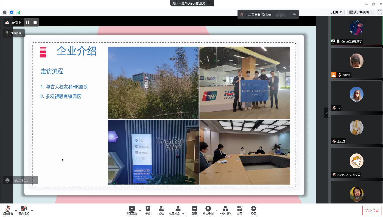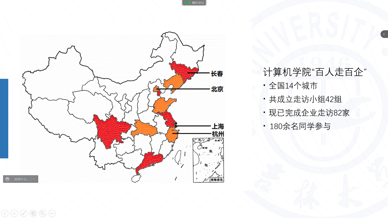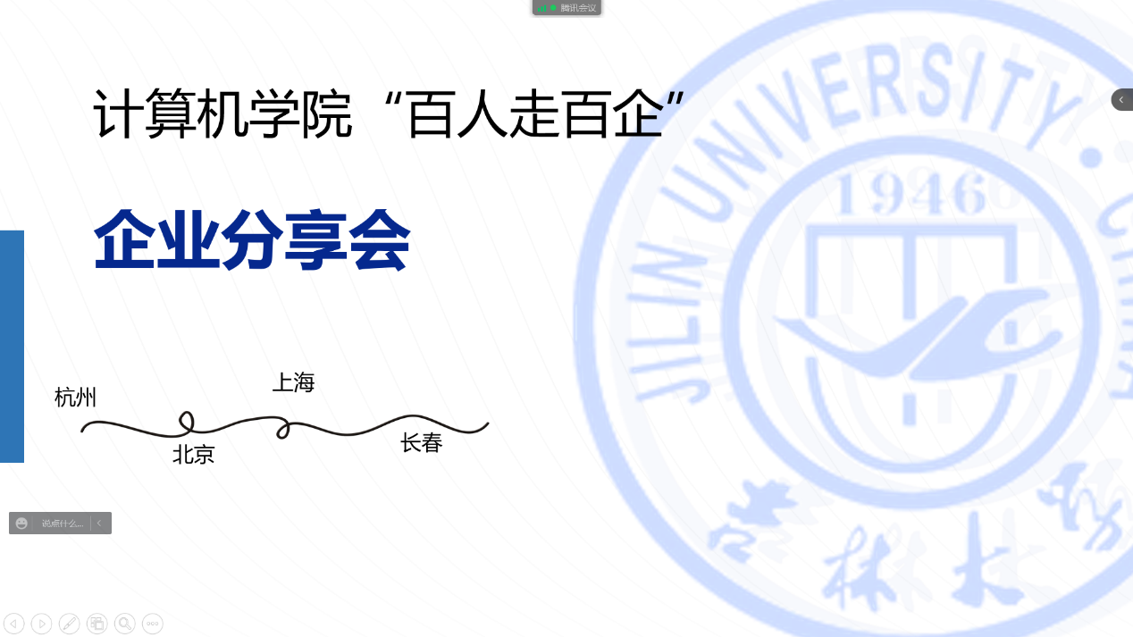 为做好疫情防控条件下2022、2023届毕业生就业工作,便于同学们获取更多就业信息,解答同学们就业疑惑,帮助同学们树立正确的就业观念,使同学们在就业路上走得更加顺畅,4月6日晚18:00,计算机学院成功举办了“筑梦青春 助力成长”就业系列活动之“百人走百企”线上交流分享会。会上分享了长春、北京、杭州、上海四组同学走访的长光卫星、一汽集团、字节跳动、阿里巴巴、中国银联、上汽集团等企业的介绍、日常工作内容及薪资福利待遇等大家关心的问题。主管副书记高战国、辅导员薛珊及计算机学院200余名本硕同学参加了此次线上交流分享会。