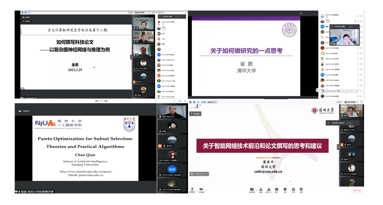 本次活动从2022年3月25日至4月20日,共分四个上午进行。天津大学的金弟副教授、清华大学崔鹏副教授、南京大学钱超副教授和深圳大学崔来中教授四位老师进行分享。分享主题涵盖了复杂神经网络、人工智能前沿、演化计算智能及智能网络技术前沿。同时,四位老师也为两院师生们就“如何选题”、“如何写好论文”等有关论文写作方面的问题给出了宝贵建议。系列课程受到了a片网