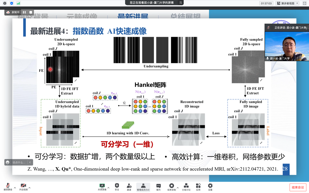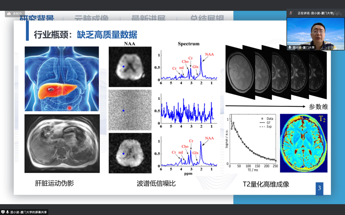 在讲座中,屈老师围绕着磁共振成像中的科学问题开展了本次学术报告。首先,屈老师总结了磁共振成像领域内面临的瓶颈:成像速度慢、缺乏高质量的数据。之后,介绍了其团队正在开发的一套智能云脑成像系统,该系统支持多种核磁成像重建模型,支持人工数据标注、主观图像质量评估等功能。该系统为弥补本领域的瓶颈具有重要价值。最后,屈老师详细介绍了其团队目前的研究进展,包括物理驱动的磁共振成像、解析模型驱动的人工智能、基于指数函数的驱动成像等。