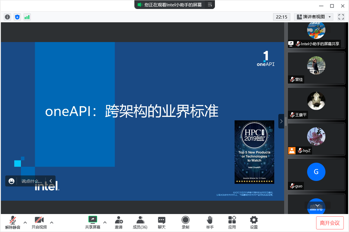 赵鹏博士首先介绍了人工智能软件的发展与挑战。现如今的人工智能算法对于算力的要求逐渐增大,传统的CPU难以满足大规模的计算需求,因此产生了多种新型架构如GPU、FPGA等,异构计算模式在人工智能领域逐渐得到大规模应用。在多架构模式下,专用工作负载日益增多,并且需要不同的计算模式,而且每种计算模式都需要单独的编程工具,导致了软件维护扩展问题。因此,赵鹏博士提出,Intel设计了名为oneAPI的编程模型,oneAPI是一种统一的开发工具组合和软件接口,可以让开发人员在CPU、GPU、FPGA、AI加速器等计算架构上实现“高效开发,任意扩展”,旨在简化并且统一跨不同架构、跨不同厂商之间的编程。oneAPI对多种人工智能生态系统实现了支持,例如TensorFlow、Microsoft Azure等,加速了人工智能和机器学习的发展。随后,赵鹏博士介绍了oneAPI异构编程模式以及为oneAPI设计的编程语言Data Parallel C++(DPC++)。DPC++存在的意义,正是为了简化编程、提高代码在不同硬件上的可复用性,并可以根据特定的加速器进行调优。赵鹏博士介绍,DPC++是基于C++语言的扩展,它提供了硬件设备的抽象、数据访问的方法以及并行化的表达。接下来,赵鹏博士演示了oneAPI异构编程,展示了一些代码样例,讲解了相关代码段及帮助文档,帮助参会者产生了更直观的感受。