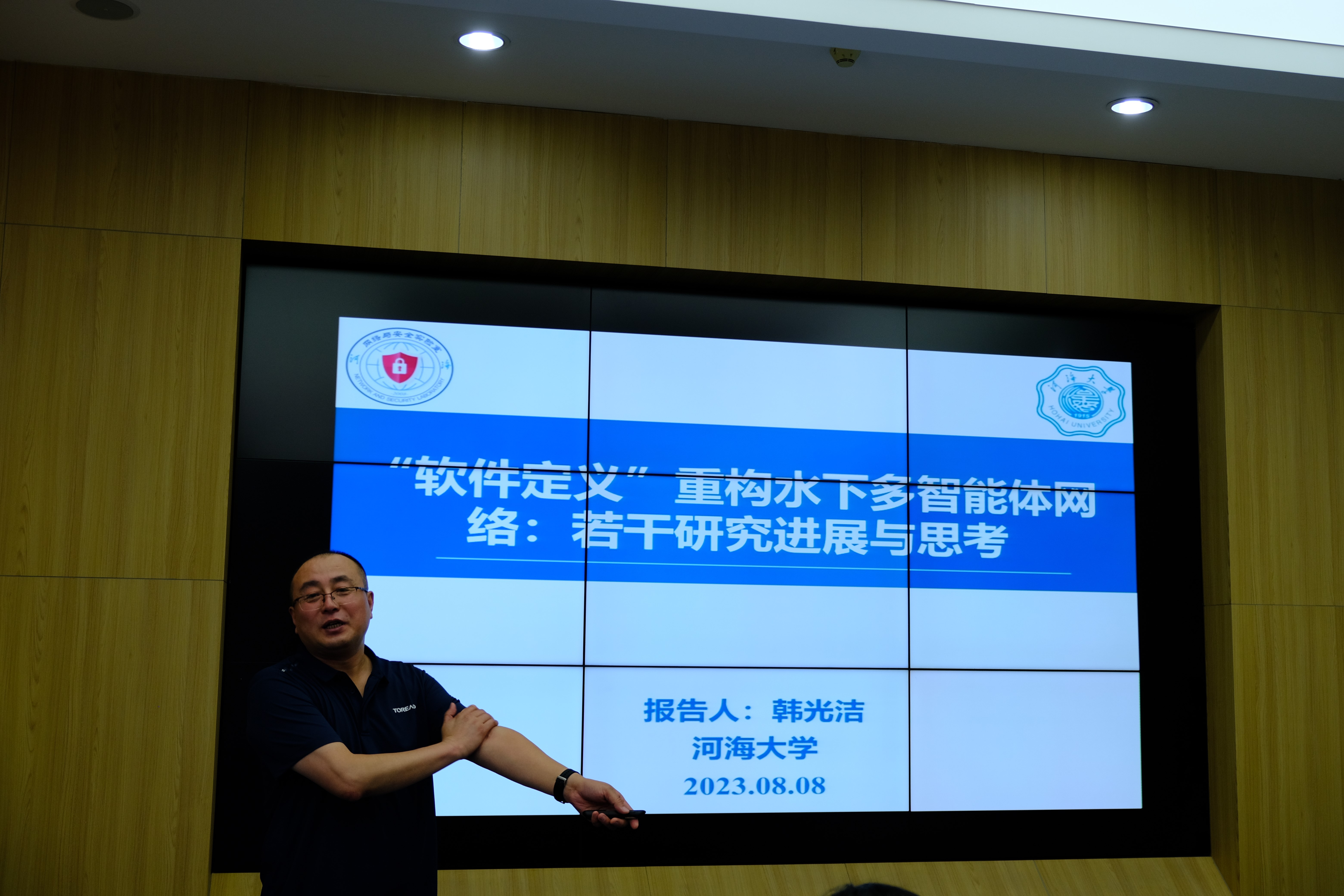 在讲座中,韩光洁教授首先引入了水下多智能体网络的概念,以支持水下智能体集群间的自主通信。在此基础上,着重介绍了 “软件定义网络”技术,通过重构水下多智能体网络的基础架构,解耦网络的控制决策与任务操作平面,以支持软件定义式的水下协同操作,提升网络可编程性及可扩展性。最后韩光洁教授结合团队在该方向的研究成果,向大家介绍了如何利用软件定义网络技术,重构水下多智能体网络的数据路由架构、编队航行架构以及自主学习决策架构。
