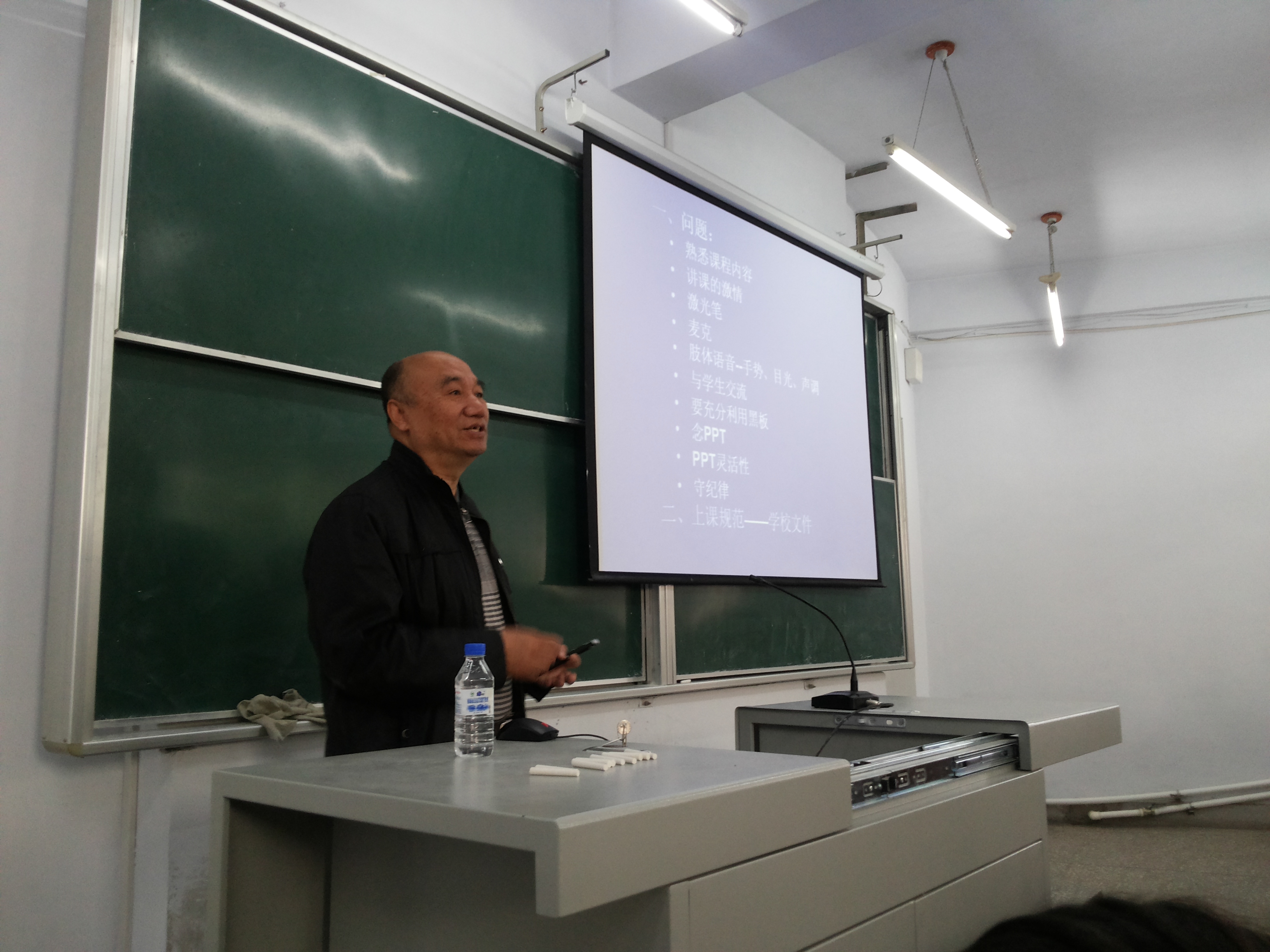 接着,张长海教授就本学期教学检查,在授课教师中普遍存在的问题进行了总结和分析。他提出,教师必须要非常熟悉课程内容;上课一定要携带激光笔并且上课前充好电;要正确使用麦克,使教室后面的学生也能听清;讲课要有激情,要注意手势、目光、声调等;上课需要与学生互动;要充分利用黑板,黑板和PPT结合使用,不要光念PPT,PPT制作要灵活,能激起学生学习兴趣;要求授课老师认真学习和遵守《a片网