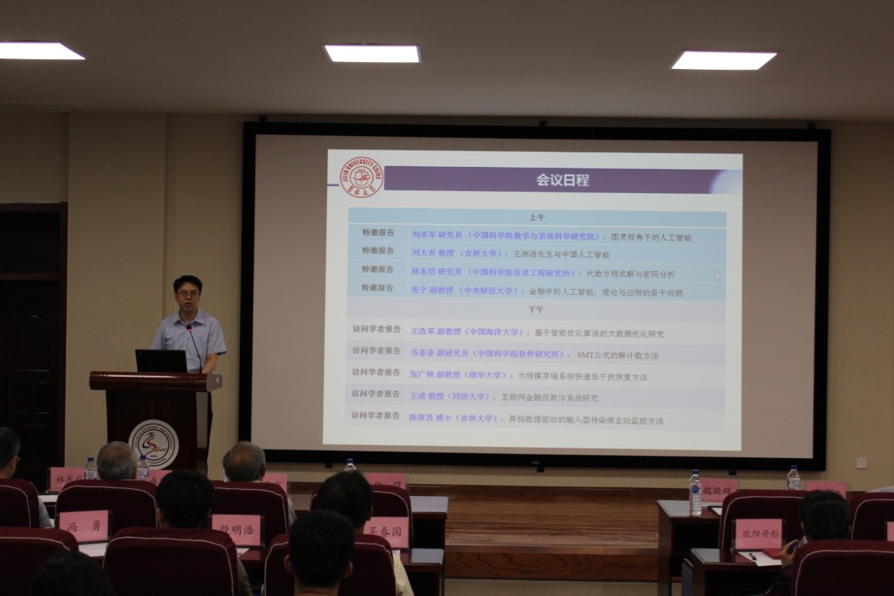 计算机学科奠基人王湘浩院士的壮丽人生,并重点介绍其在关键时刻与吴文俊院士、陆汝钤院士共同为推动中国人工智能发展所做出的卓越贡献。刘东岱研究员的报告题目是“代数方程求解与密码分析”,报告从流密码算法的代数攻击出发,介绍代数攻击的思想、方法以及由此产生的密码设计新准则。张宁副教授的报告题目是“金融中的人工智能:理论与应用的若干问题”,报告基于讲者在人工智能在金融方面应用的相关理论和应用的工作经验,从行业角度、学术角度和监管角度对两者融合提出了12个问题,并对这些问题在不同程度上提供了一些解决途径、探索和思考。