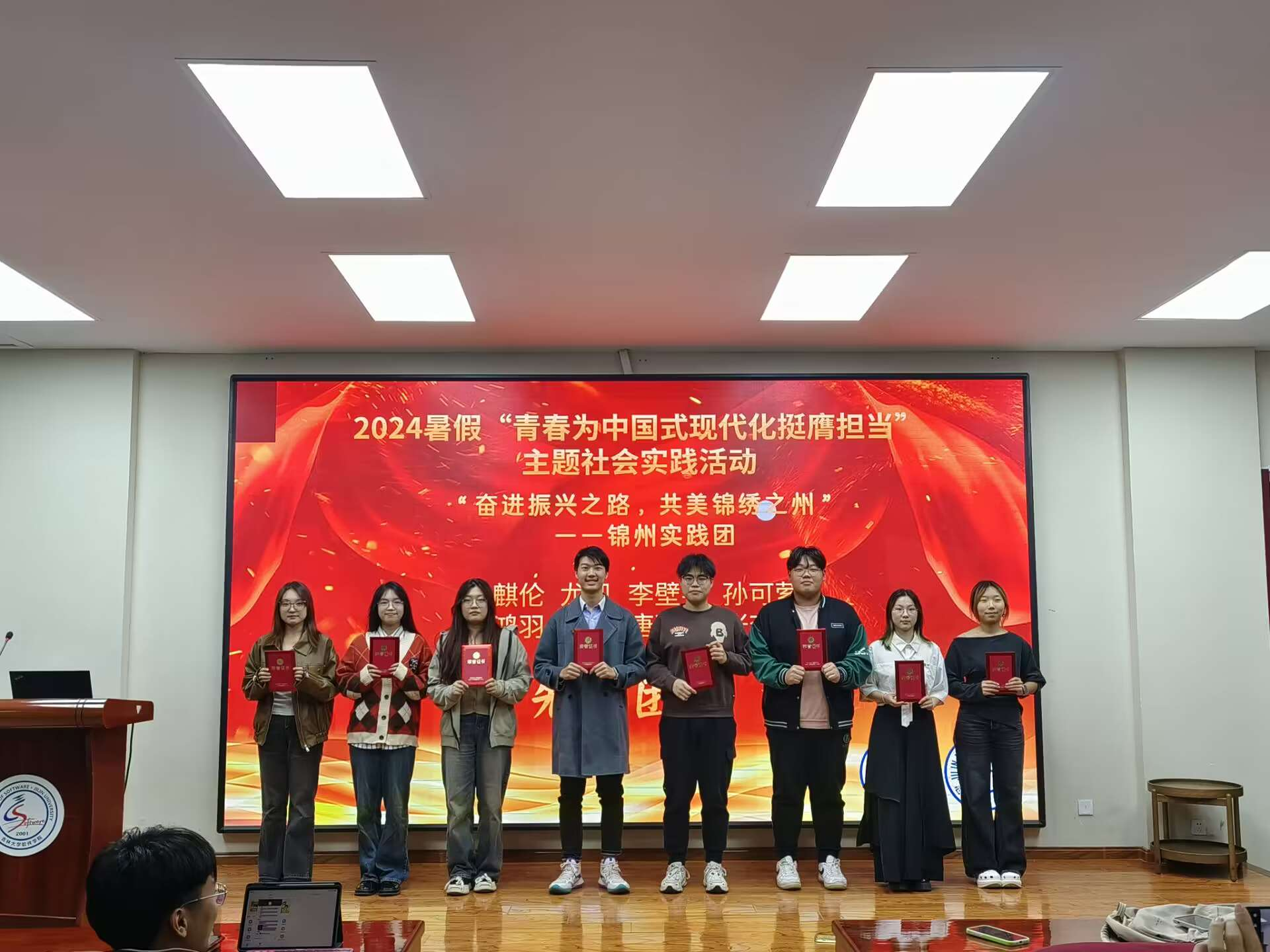 学生会志愿服务部代表给五个先进团队颁奖。