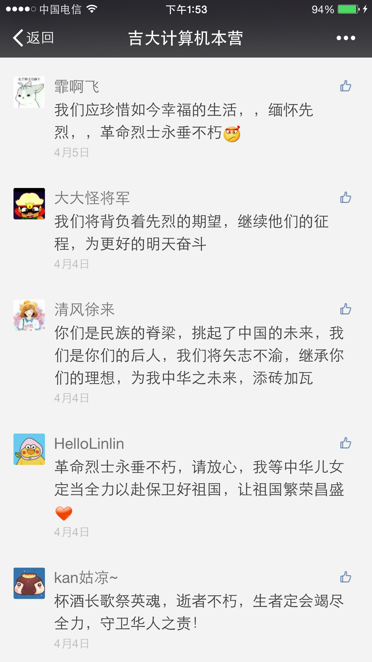 计算机学院于南湖公园进行清明祭扫活动的同时,计算机学院信息部在“吉大计算机本营”微信公众号上推送了一篇关于倡导清明节追悼先烈活动的文章。该文章一经发布,随即获得全校师生的广泛关注。