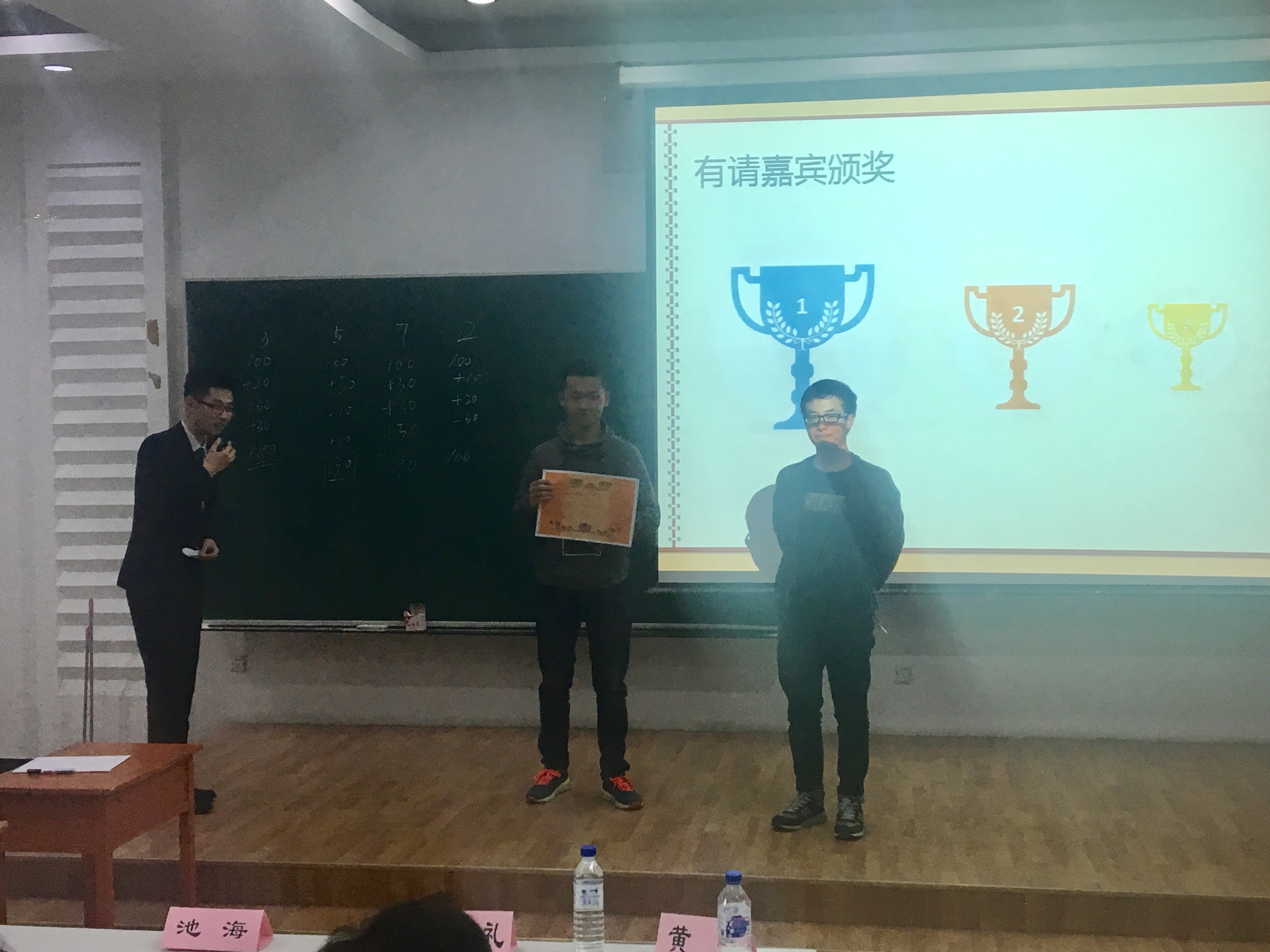 在主持人精彩的开场白过后,比赛开始。在五道必答题的热身结束后,便是精彩的抢答环节。参赛选手积极参与,争相举手,场面格外热闹,观众也阵阵喝彩。伴随着主持人宣布最后进入决赛的名单,抢答环节也终于结束,七支队伍中有四支队伍成功闯入决赛。在竞赛间歇中,他们还组织了趣味游戏环节。主席团、参赛选手们均派出代表参加了游戏。主持人的幽默风趣,参与游戏的同学们的全身心参与,使得大家在严肃的两会知识竞赛中渐渐放松下来。在最后的决赛中,由参赛选手选择比赛难度进行最后角逐,竞赛主要就医疗方面、人民币汇率、建成小康社会的渠道等方面进行了问答,看着各队分数的不断拉开,题目难度不断加大,观众也不得不惊叹选手的智慧和题目的巧妙。比赛最后,三支队伍脱颖而出,分别获得了一、二、三等奖,获得了精美的奖品。