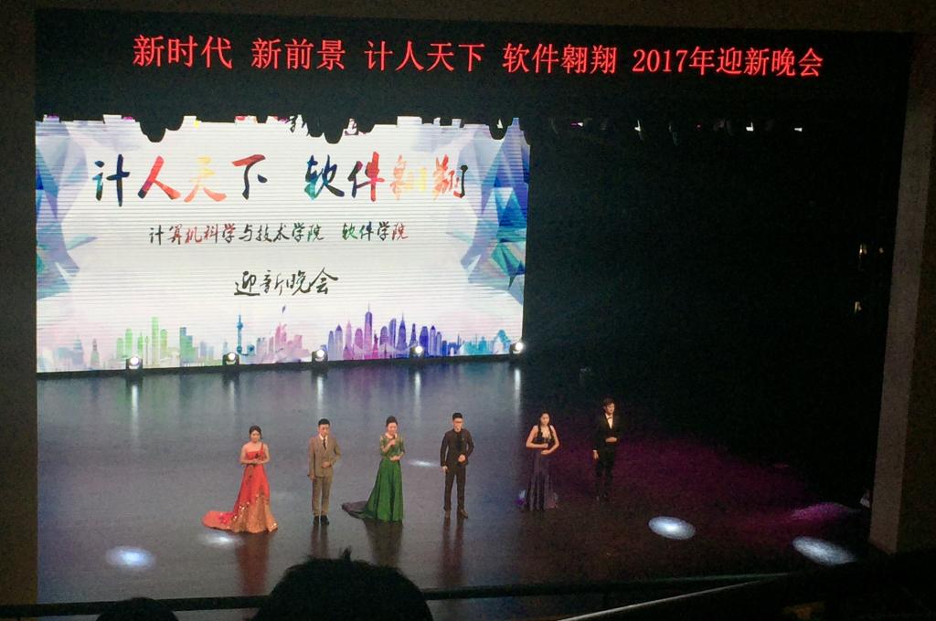 晚上18:30,迎新晚会准时开始,在主持人的引导下,所有观众起身奏唱国歌,计算机学院党委书记孟繁二老师宣读两院“2017年度优秀学生”获奖名单并颁奖合影,之后还有优秀学生代表为新生讲述大学生活的多姿多彩,最后是计算机学院、软件学院院长,博士生导师魏晓辉教授致辞,颁奖典礼到此告一段落。